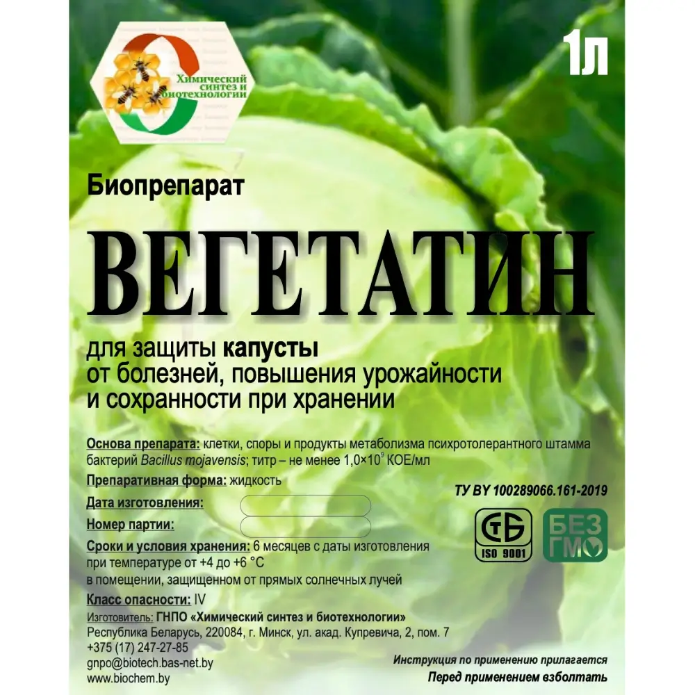 Эффективность, принцип действия: вегетатин улучшает фитосанитарное состояние растений капусты, снижая их пораженность бактериозами и болезнями грибной этиологии более чем на 50%, оказывает положительное влияние на продуктивность, урожайность капусты, способствует повышению лежкоспособности при хранении.